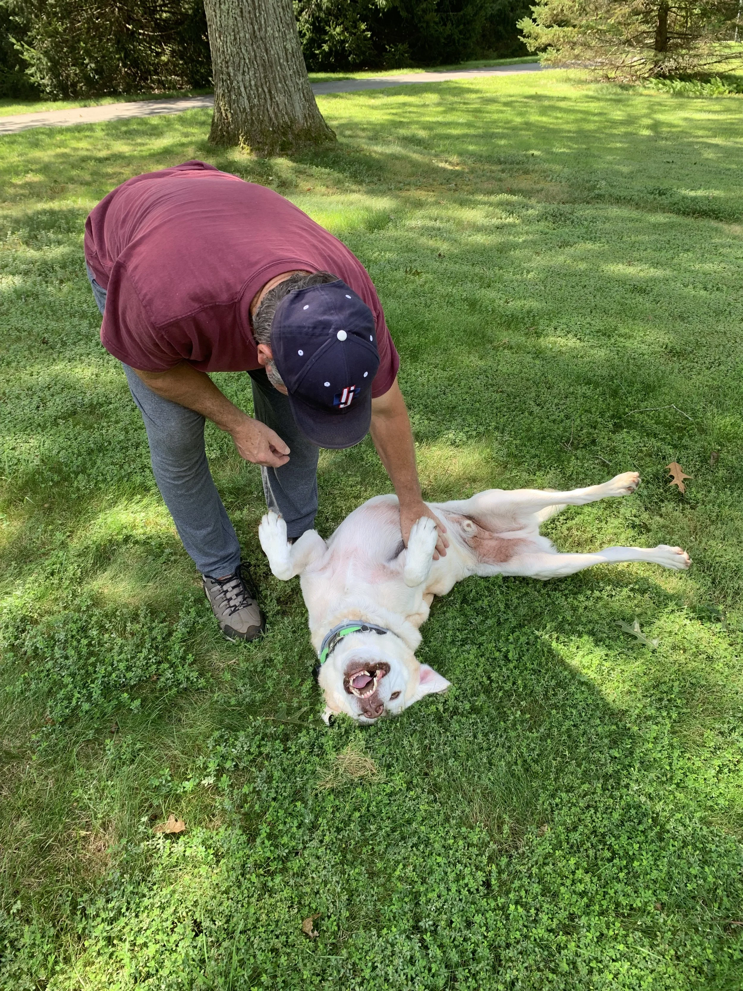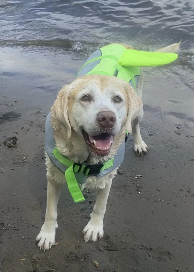 Remi loved life. He loved swimming, hiking, car rides, playing in the snow, sneaking treats, belly rubs, his large tennis ball, and his beloved yellow “dino” toy. Remi also enjoyed obstacle courses, animal blessings, crosswalks, visiting any store that would welcome him inside, and falling asleep on my lap or in my arms. He adored people and was unfailingly gentle with everyone he met, especially children. Remi would walk past people and lick their hands, getting their attention and making them smile.