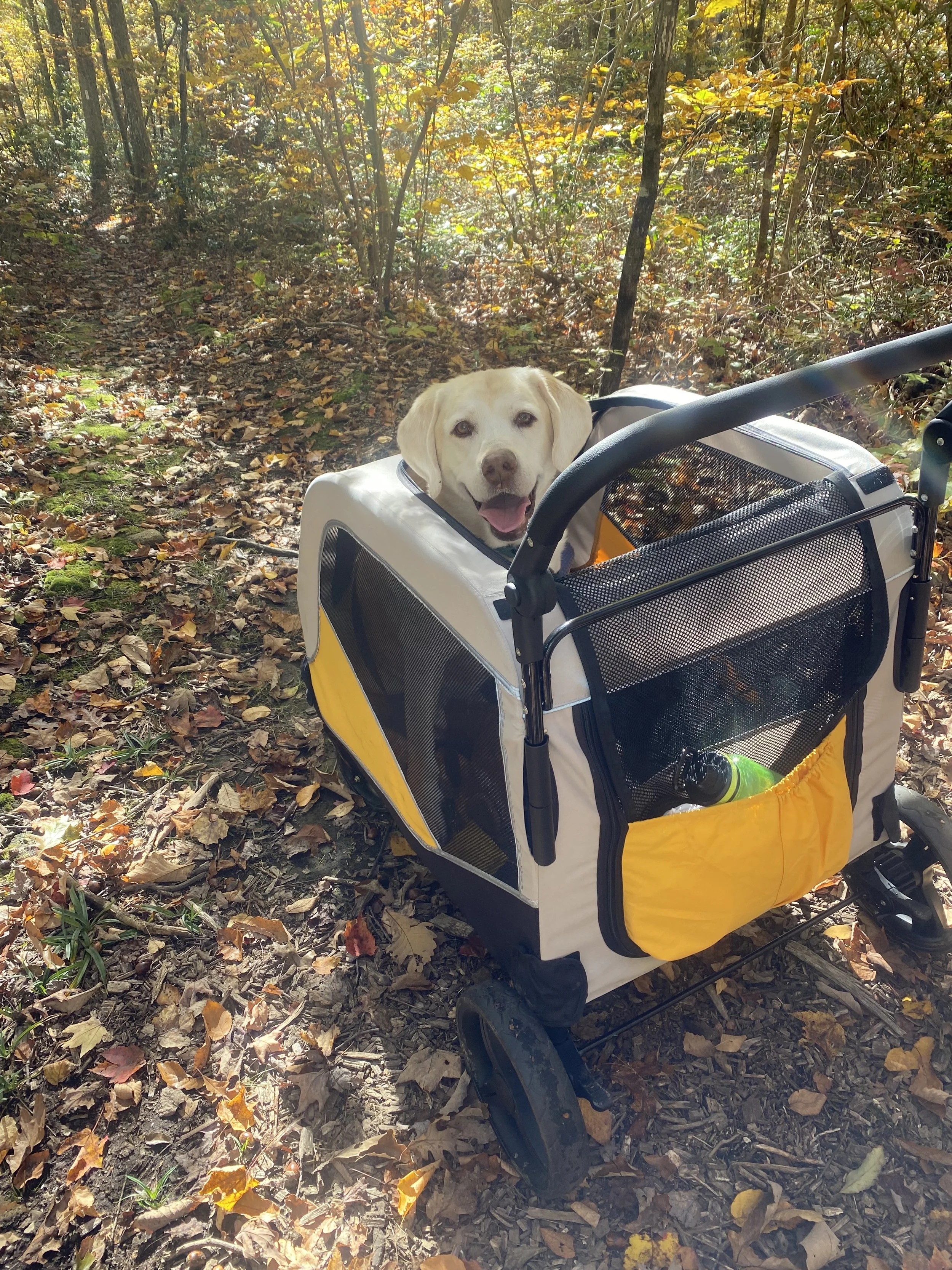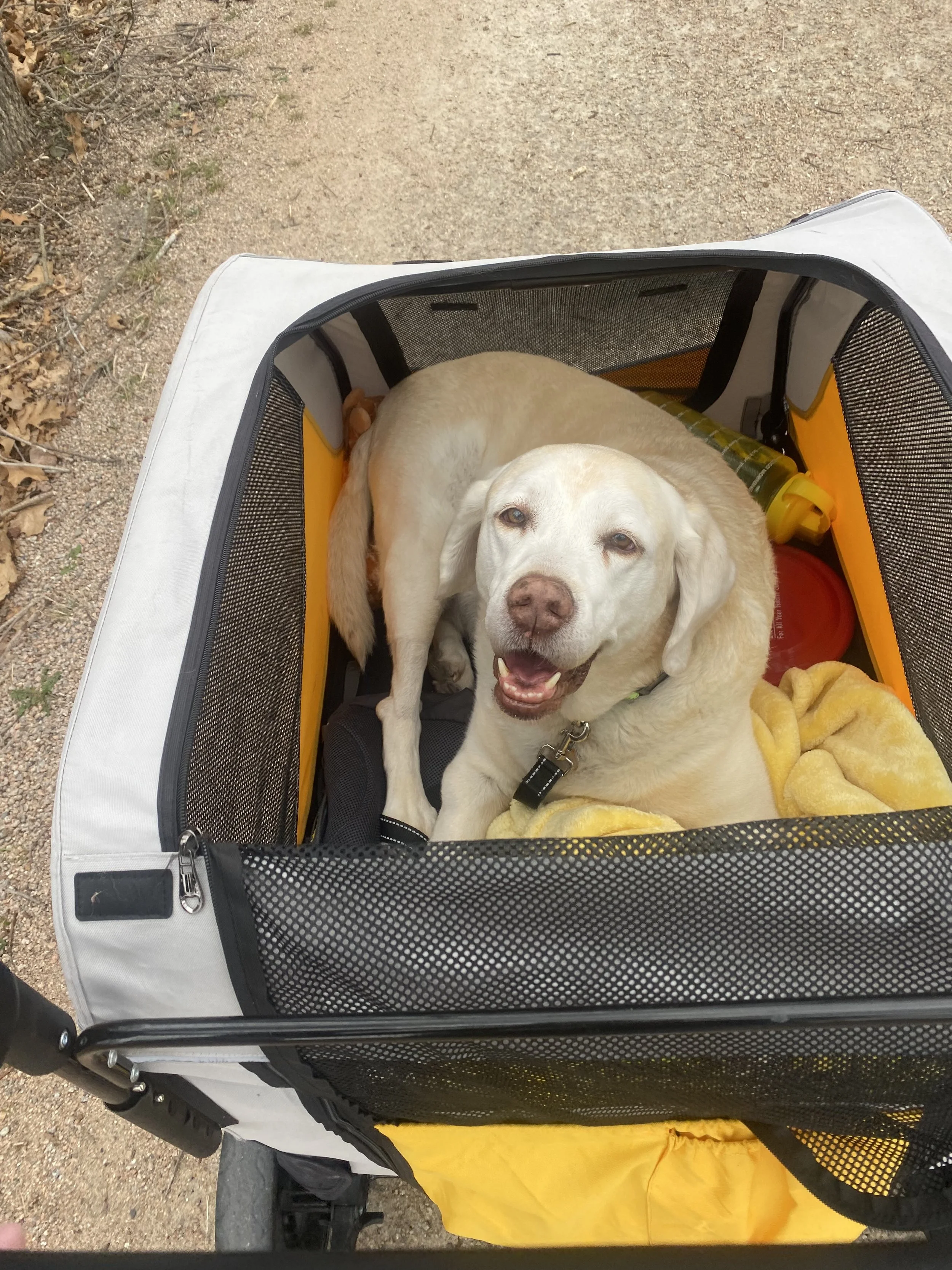 Remi lived with diabetes and required insulin shots every day. He later lost his eyesight but recovered it through cataract surgery. He suffered a gallbladder blockage that required emergency intervention. All his life he was plagued by severe allergies. In his final years, he battled arthritis and took some of his walks in his yellow stroller. Despite all of this, Remi greeted every day with a wagging tail. He would lick my hands when I would take his blood sugar, and he was the perfect patient for all of his insulin injections.